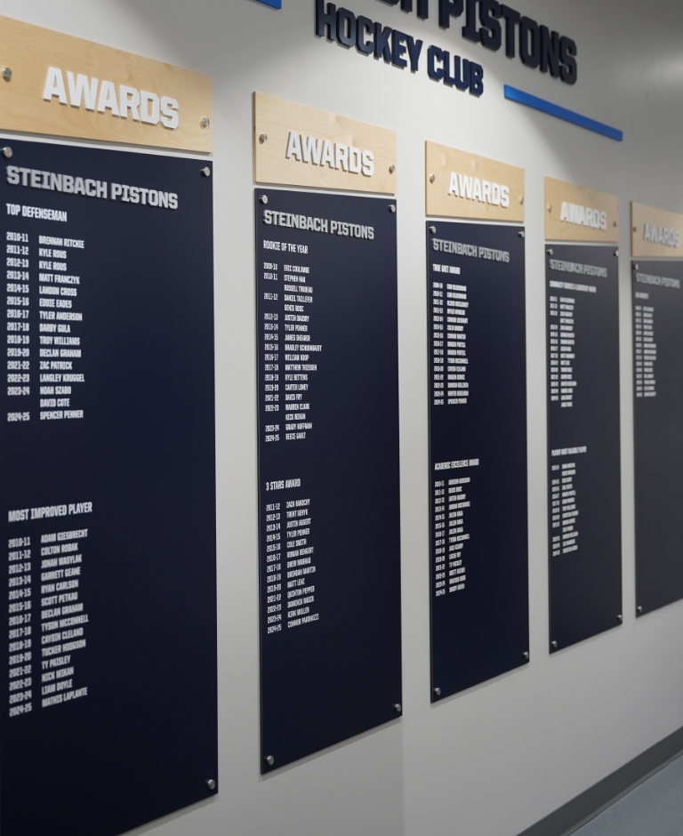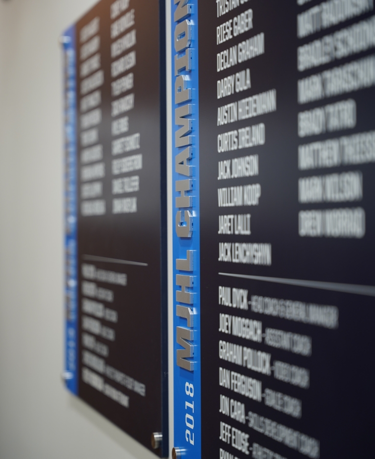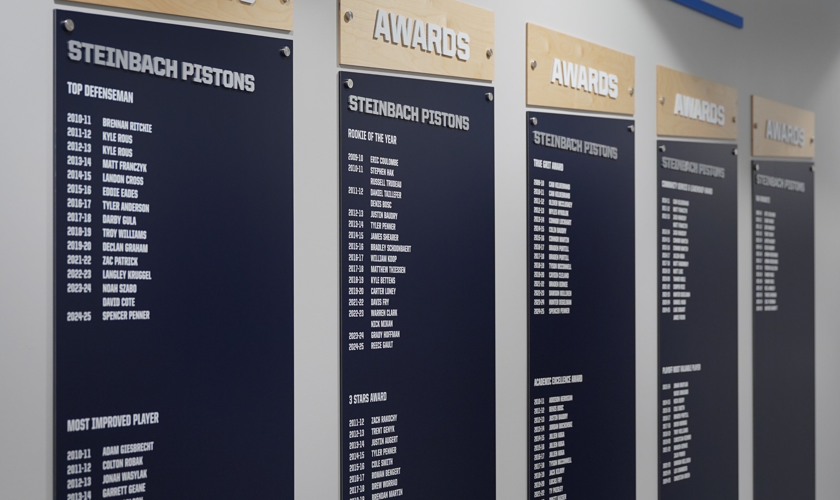 We designed and installed wayfinding signage, dimensional logos, and vinyls as part of the primary branding system. To document their history and inspire the next generation of Pistons, a series of history plaques in the player's lounge lists past championship rosters, award winners, and players who have went on to play higher levels of hockey, from college right on up to the NHL.